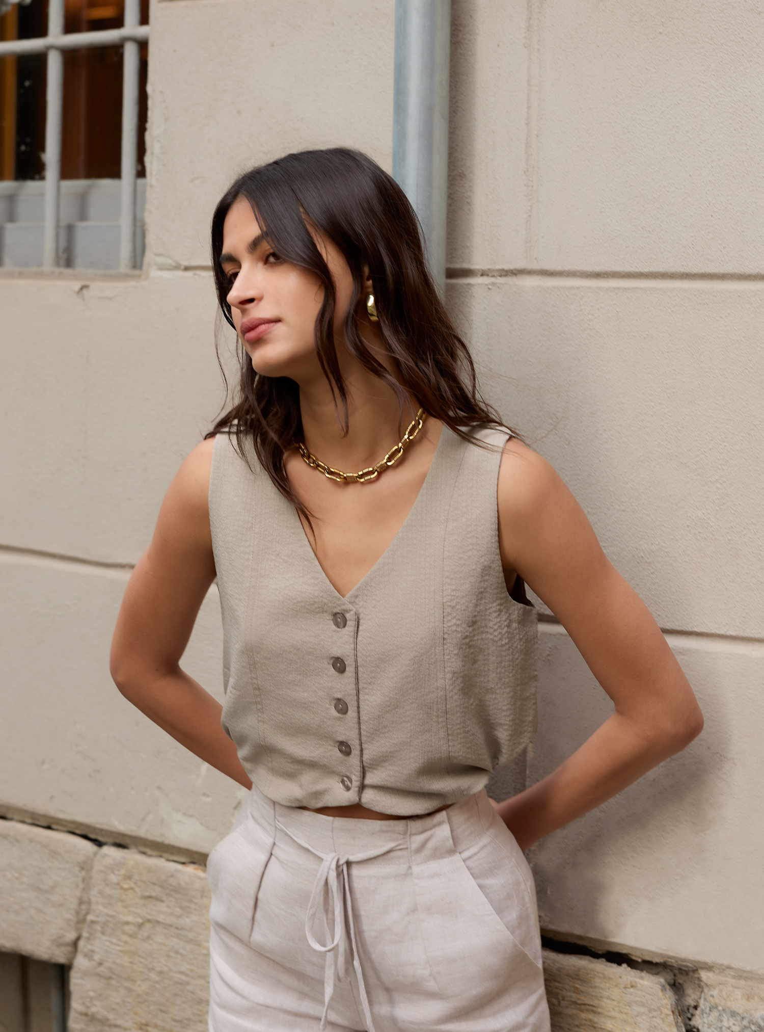 One vest, with multiple ways to wear it: The possibilities are endless with the Multi-Way Vest Top. Made with a lightweight, crease-resistant seersucker material, this versatile vest top can be styled as-is, layered and in a cropped bubble effect when adjusted with its concealed side toggles.