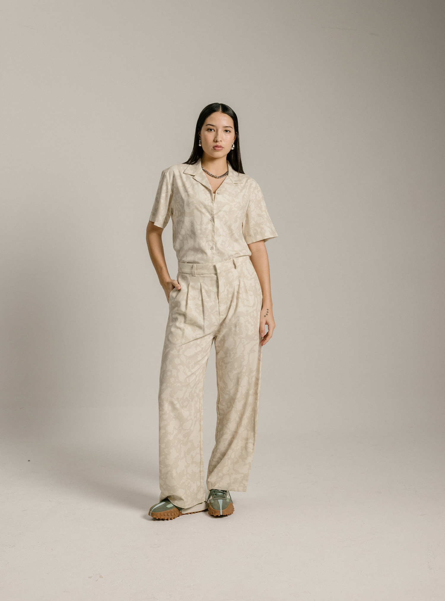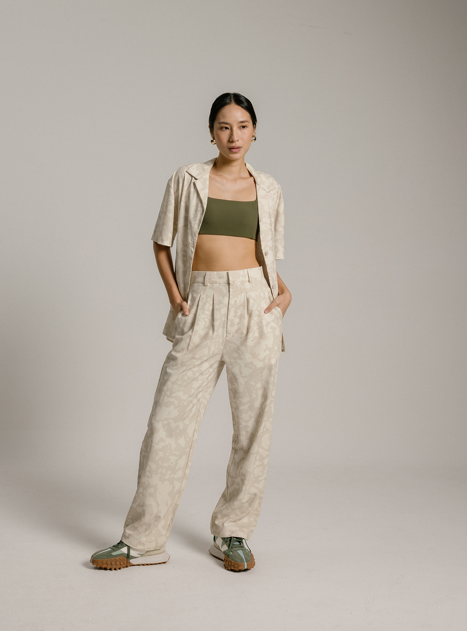 A tailored fit in the front and elasticised at the back for the best of both worlds. The Studio Resort Pants are made in a structured material that is less prone to creasing, for a dressier look. Available in a women's fit and three unique prints inspired by movements for The Paper Bunny x cheak collection. Pair it with the Studio Resort Shirt (Mineral) to make an elegant, coordinated fit, or wear as separates paired with any activewear tops from the collection to create an elevated yet seamlessly transitional outfit to go from work to brunch and the gym.